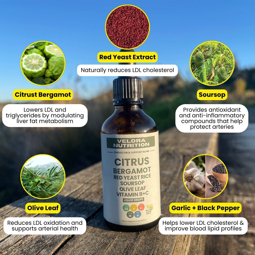 Red yeast rice, citrus bergamot, olive leaf, garlic, soursop, and black pepper extract work in synergy helping clear harmful LDL, calm arterial inflammation, and keep your heart protected.